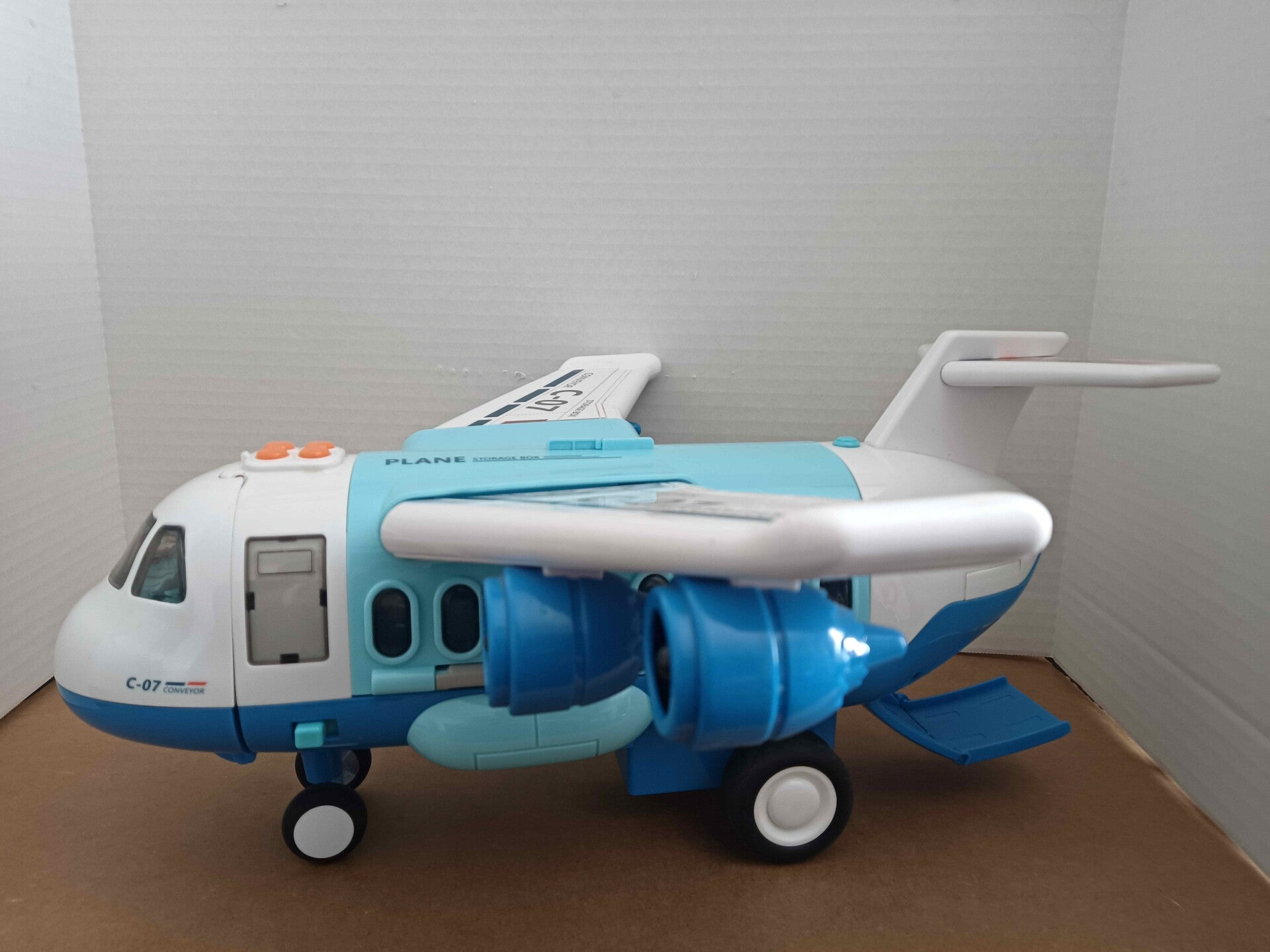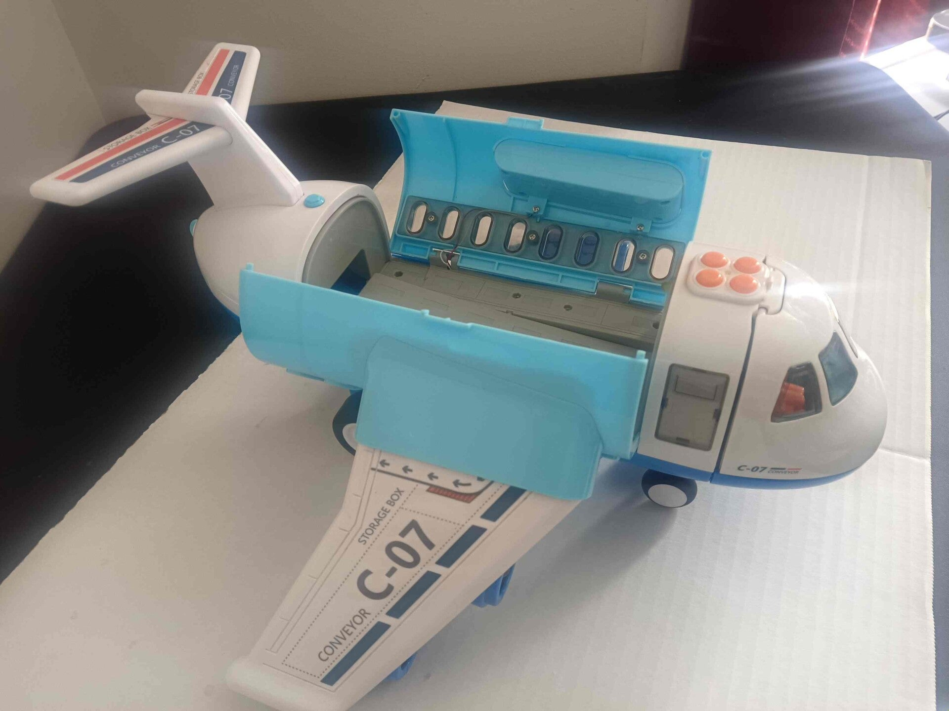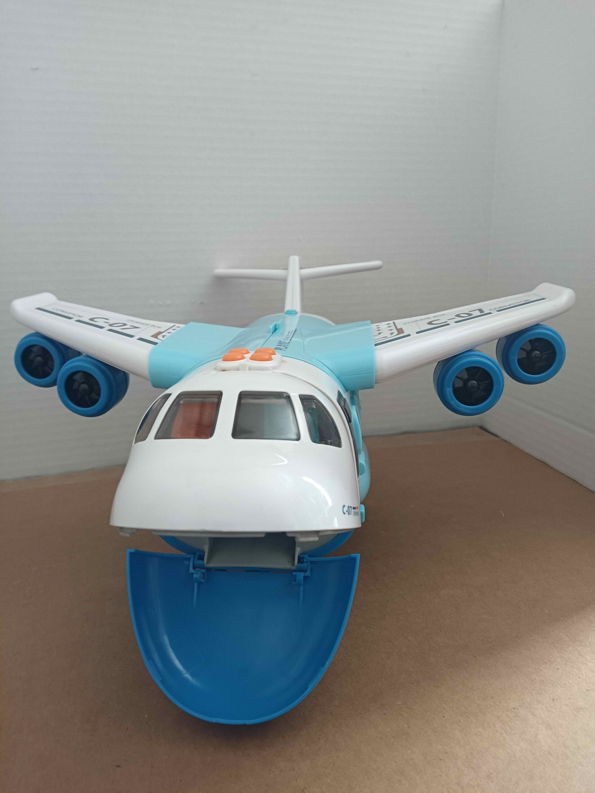 A formerly owned and slightly used C-07 Conveyor Plane and a Happy Kid Airport playset. Both have realistic sound effects and flashing lights. The plane is friction powered, and has a simulated steam jet function. The airport can speak in English and Spanish. Airport also includes 10 mini people figures. The airplane has a small crack at the top of the cab, next to the orange buttons on top. See the 4th picture.