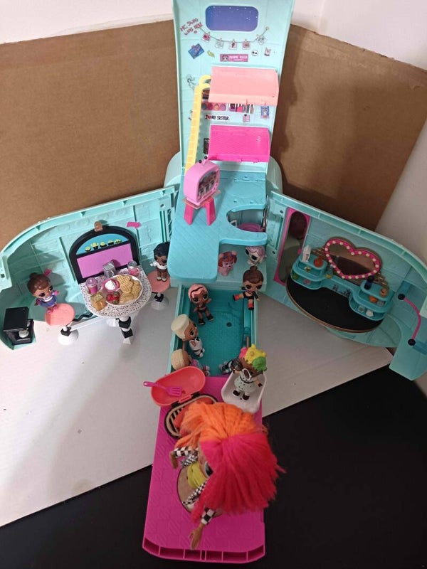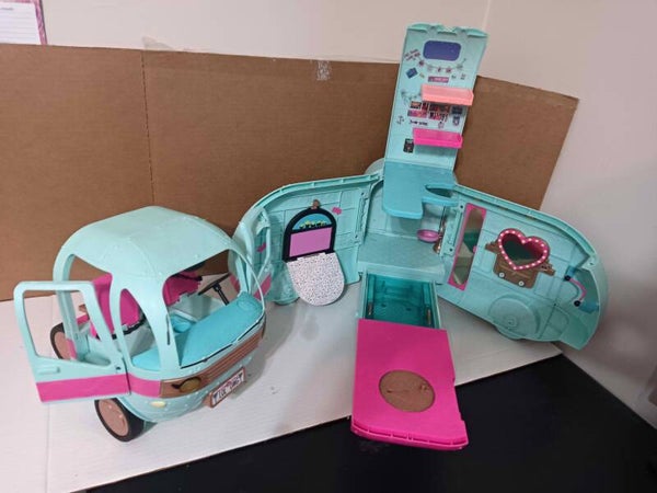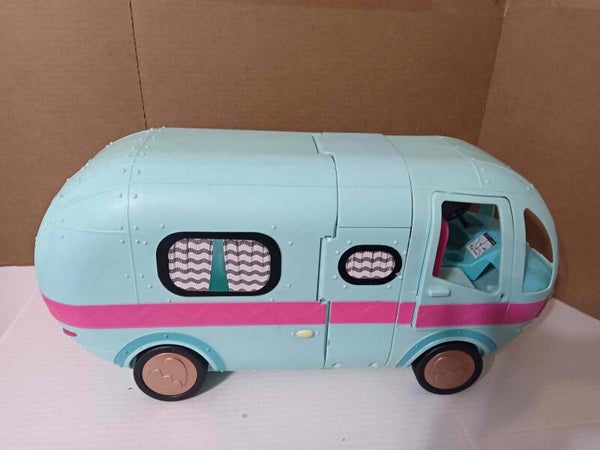 A formerly owned L.O.L. Surprise O.M.G. 4-in-1 Glamper Fashion Camper. Includes 11 dolls and accessories.